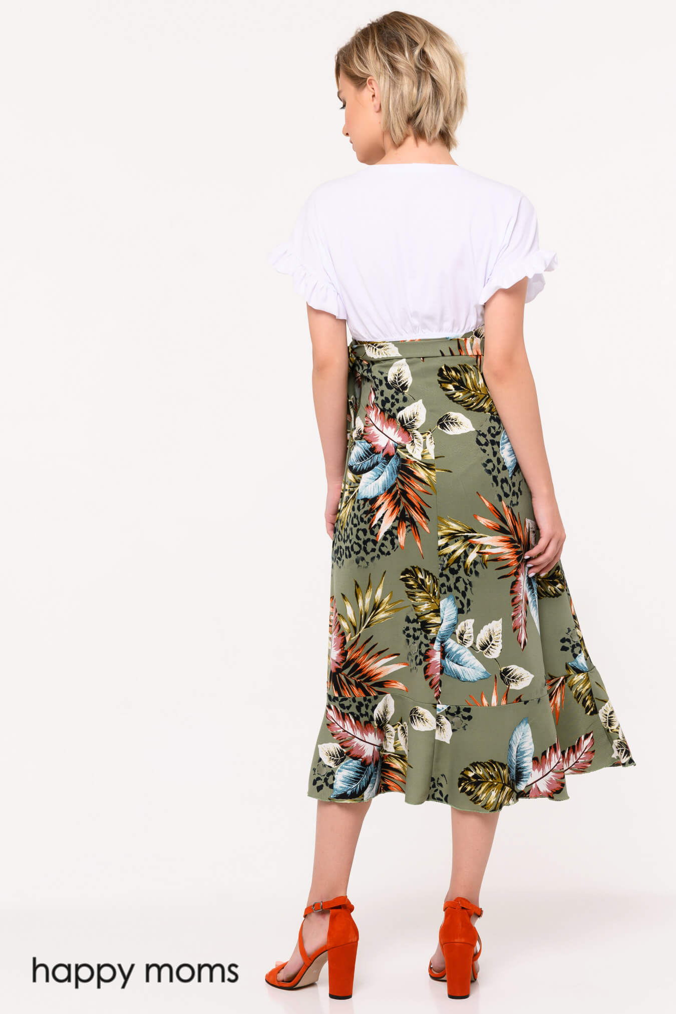 Легкая летящая юбка для беременных с запАхом оригинального кроя из струящейся ткани с тропическим принтом. Модель имеет ассиметричный низ, украшенный воланом по всей длине, который добавляет модели романтичности и нежности.