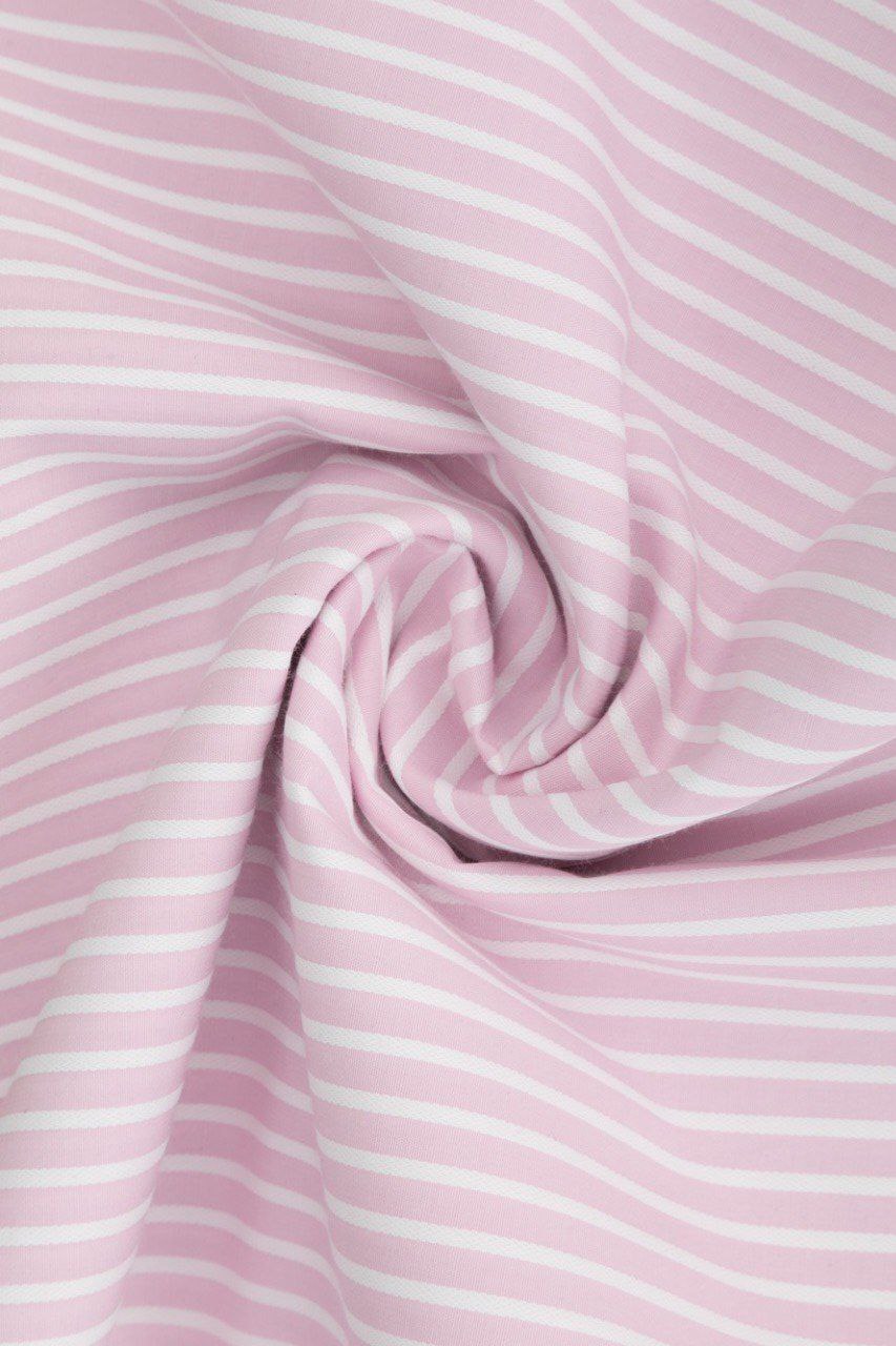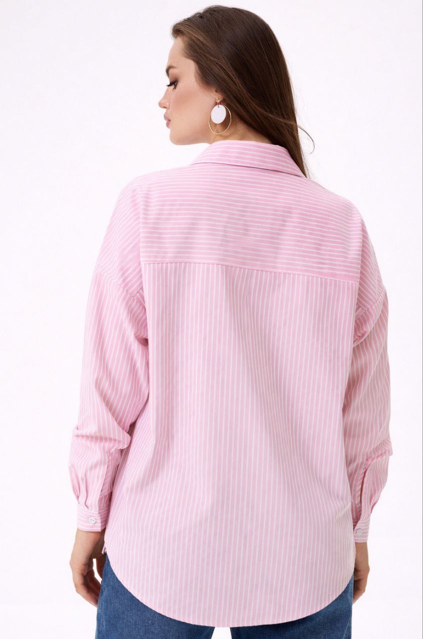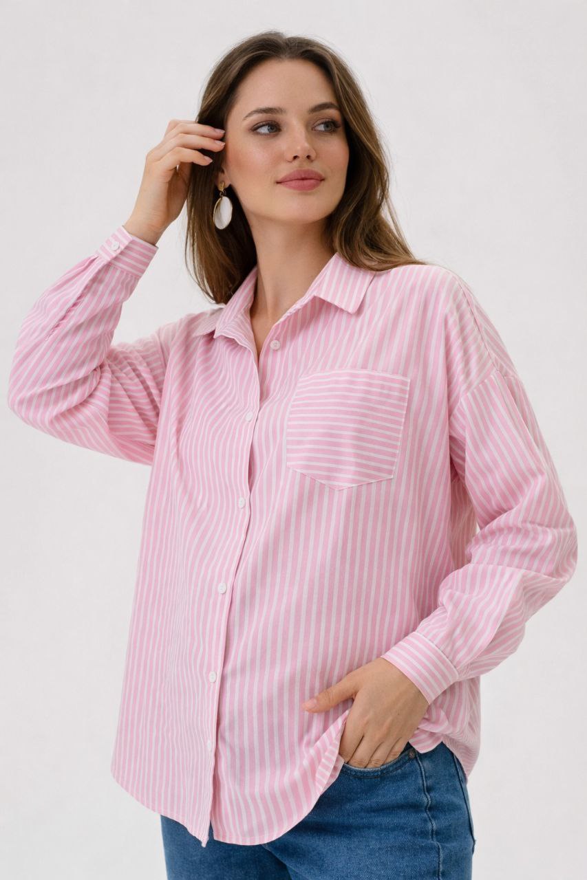 Рубашка для беременных женщин розового оттенка в белую полоску длиной до середины бедра.