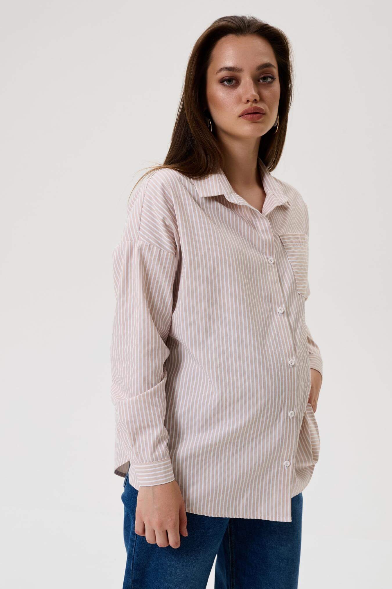 Блузка для беременных женщин бежевого цвета в белую полоску длиной до середины бедра. Рубашечный воротник переходит в застежку-планку на пуговицах.