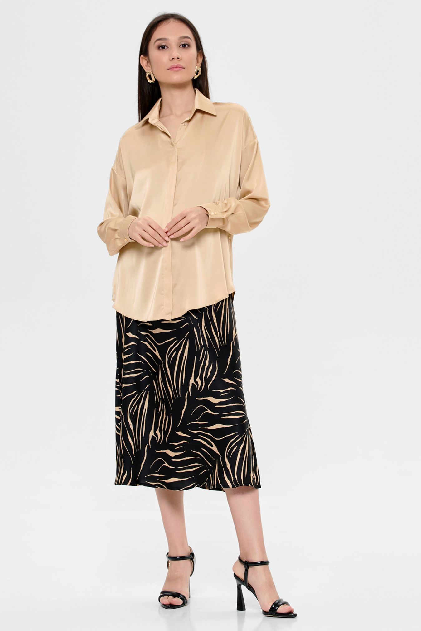 Блузка для беременных песочного оттенка классического силуэта из приятной шелковистой ткани.