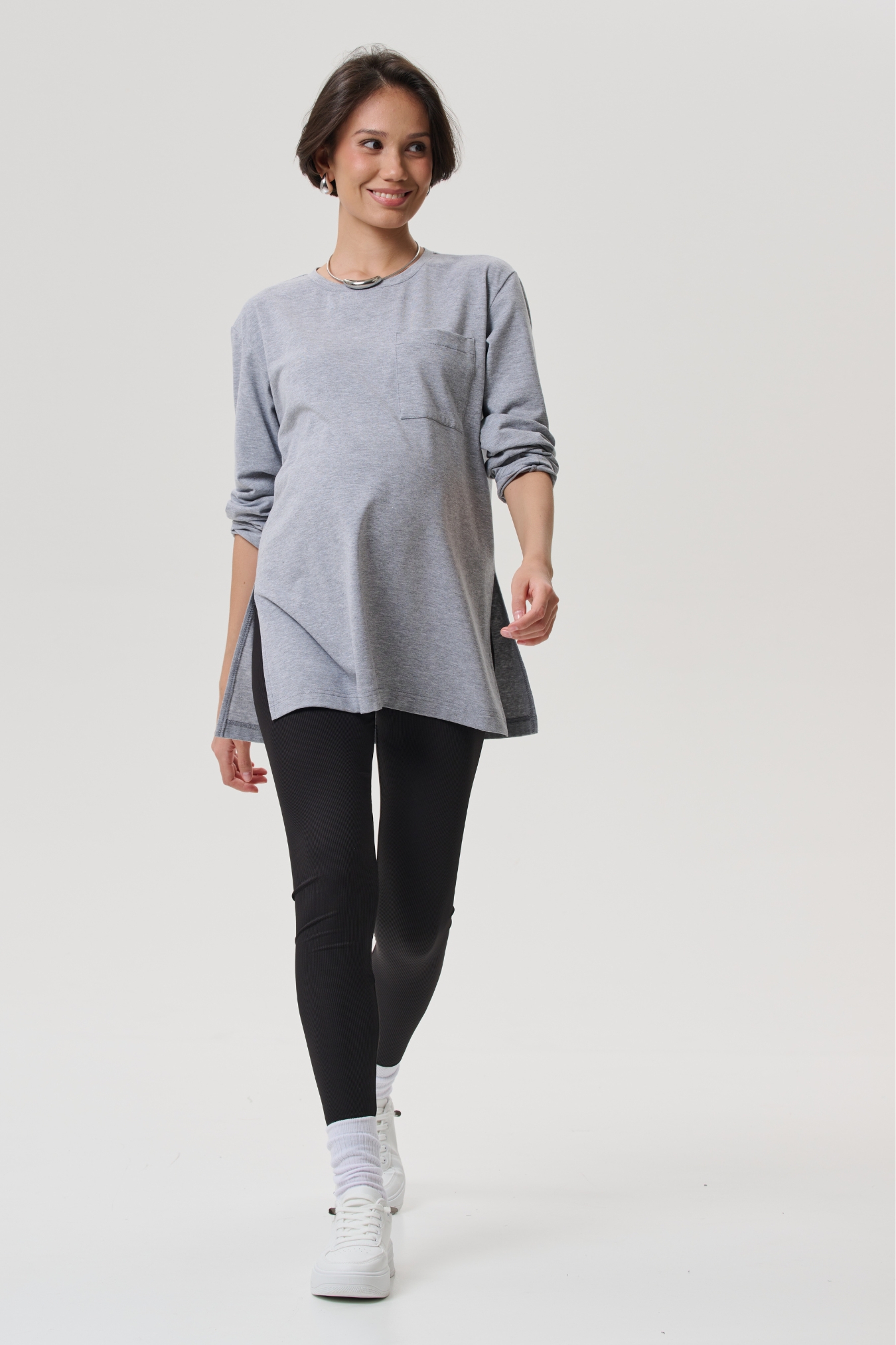 Дышащая ткань, аккуратная круглая горловина, свободные длинные рукава. На груди большой накладной карман. Просторный прямой силуэт с боковыми разрезами позволит надевать футболку на любом сроке беременности и после родов.