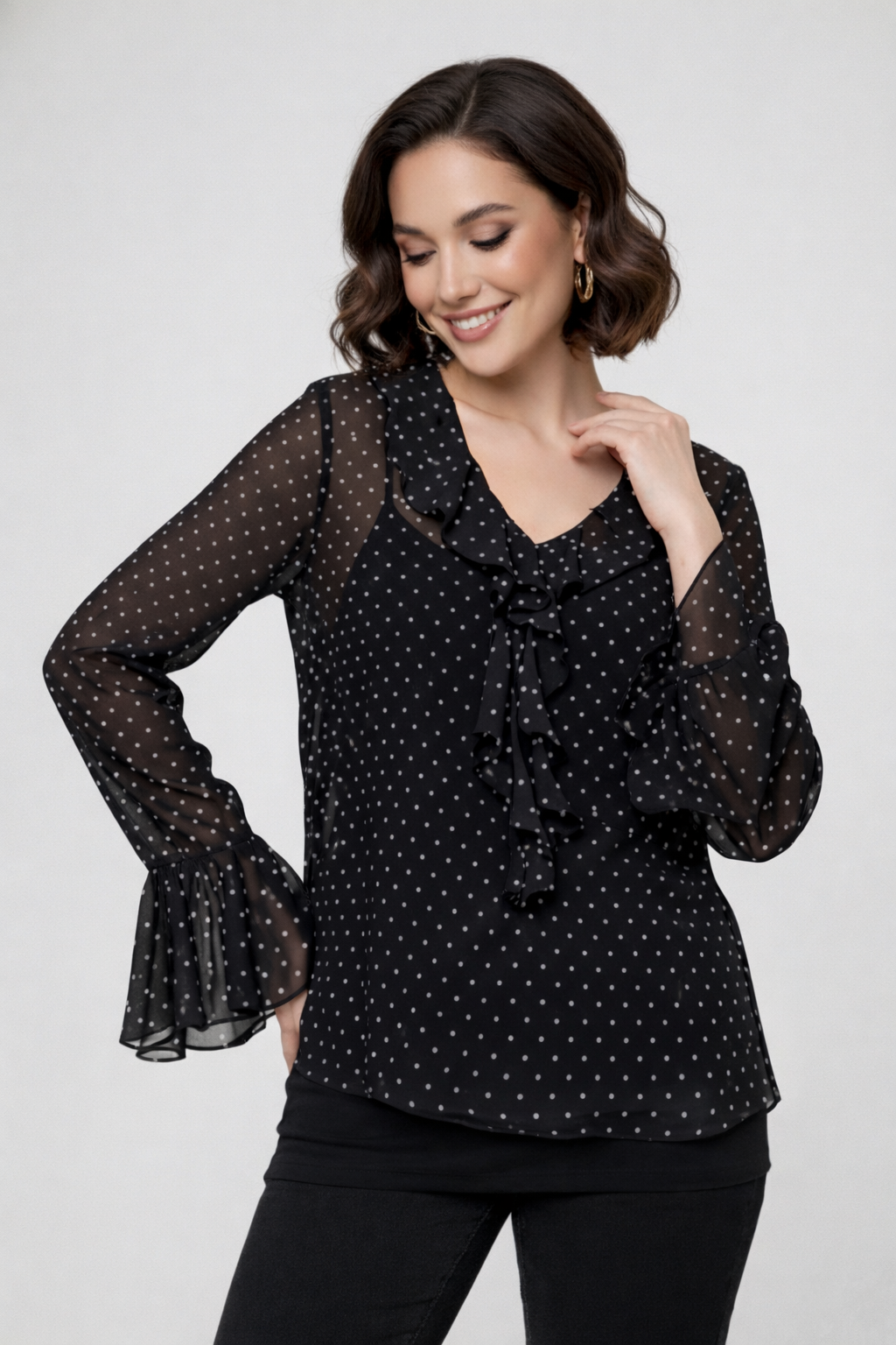Блузка для беременных женщин — лёгкая и воздушная, выполнена из нежного шифона урагри в классическом чёрном цвете с мелким белым горохом. Идеальный выбор для стильного весеннего или летнего гардероба будущей мамы. В комплект входит майка на тонких бретелях в бельевом стиле, обеспечивающая дополнительный комфорт даже в тёплую погоду.