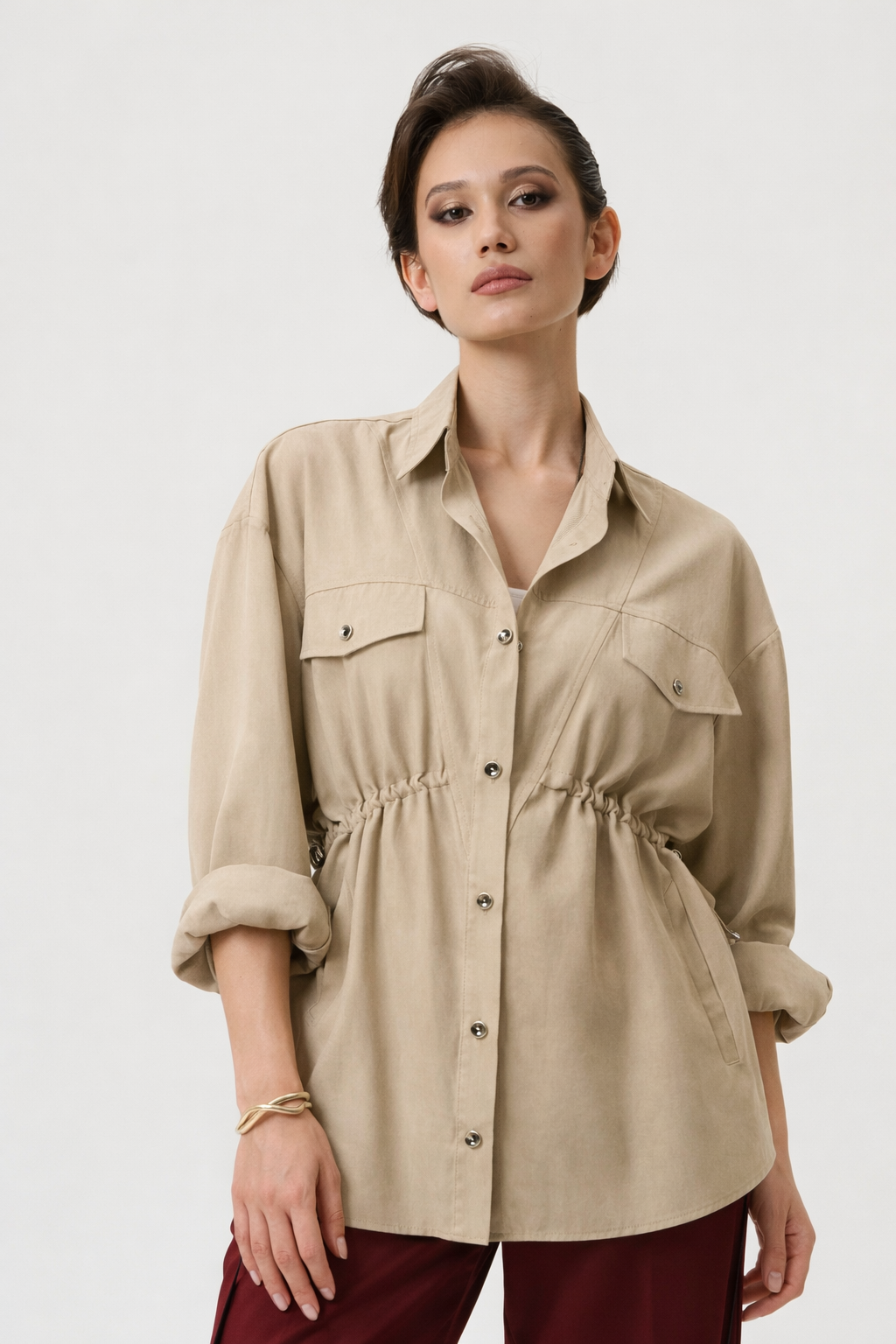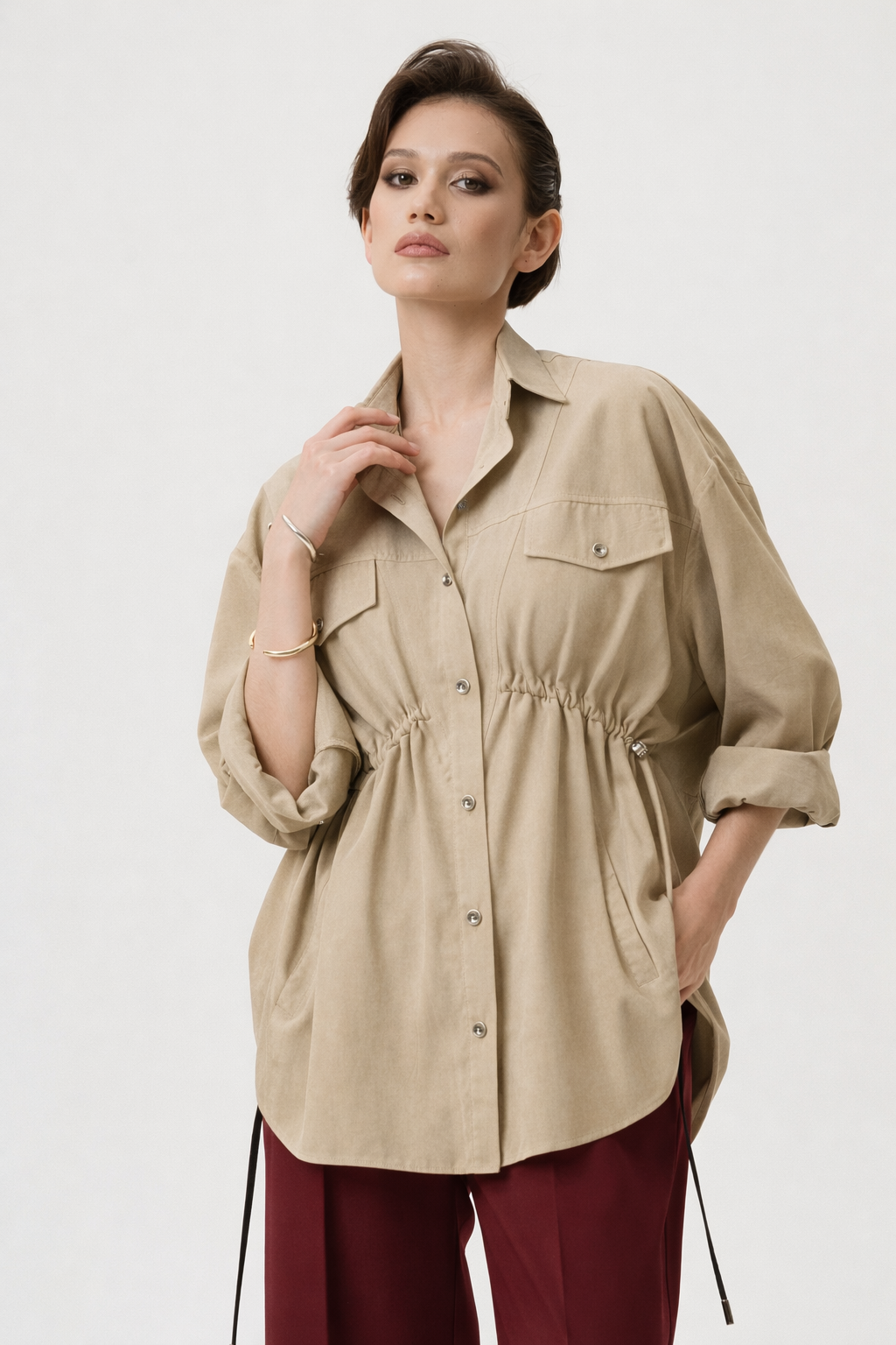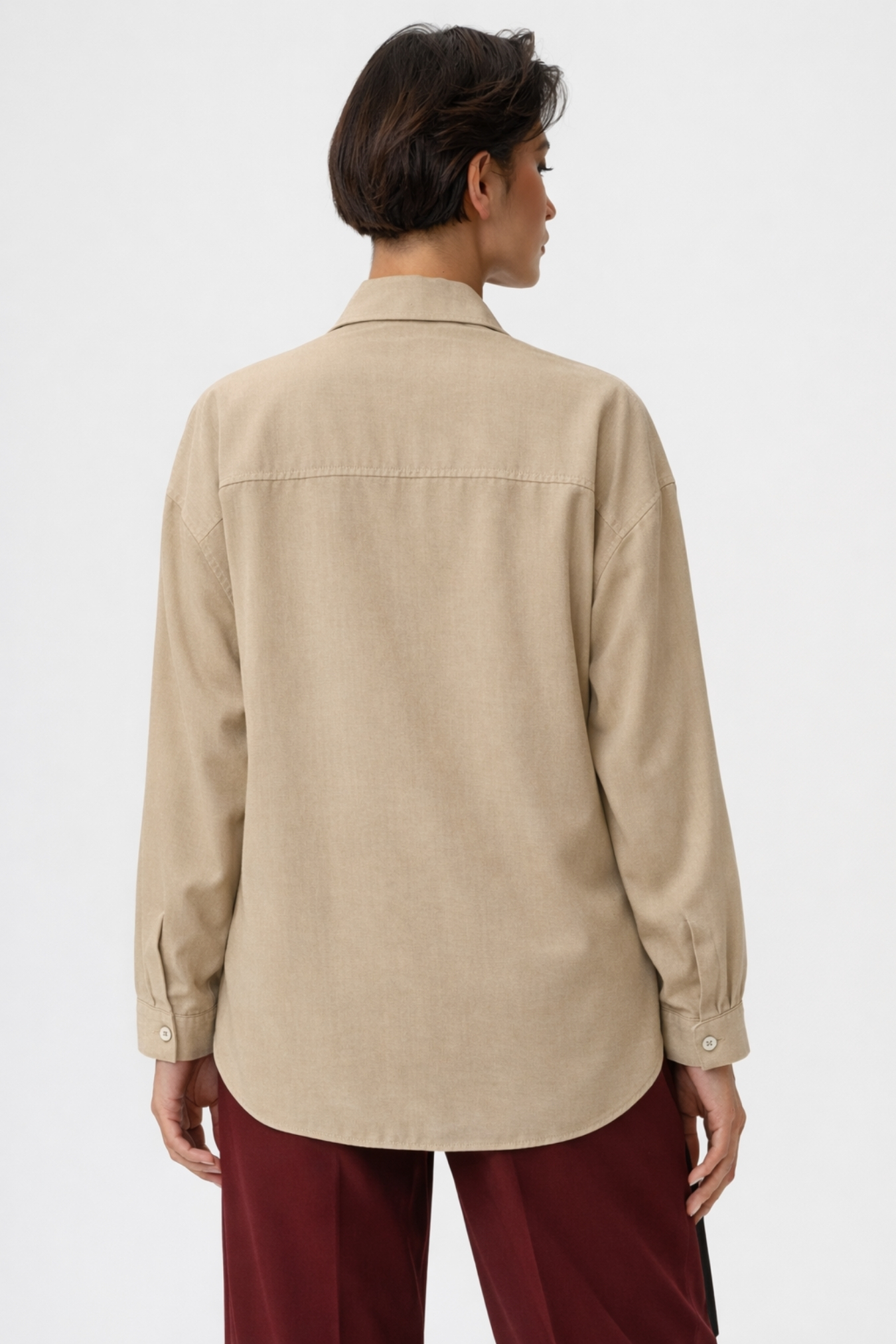 Модель можно носить как классическую рубашку или в качестве легкой верхней одежды нараспашку.
