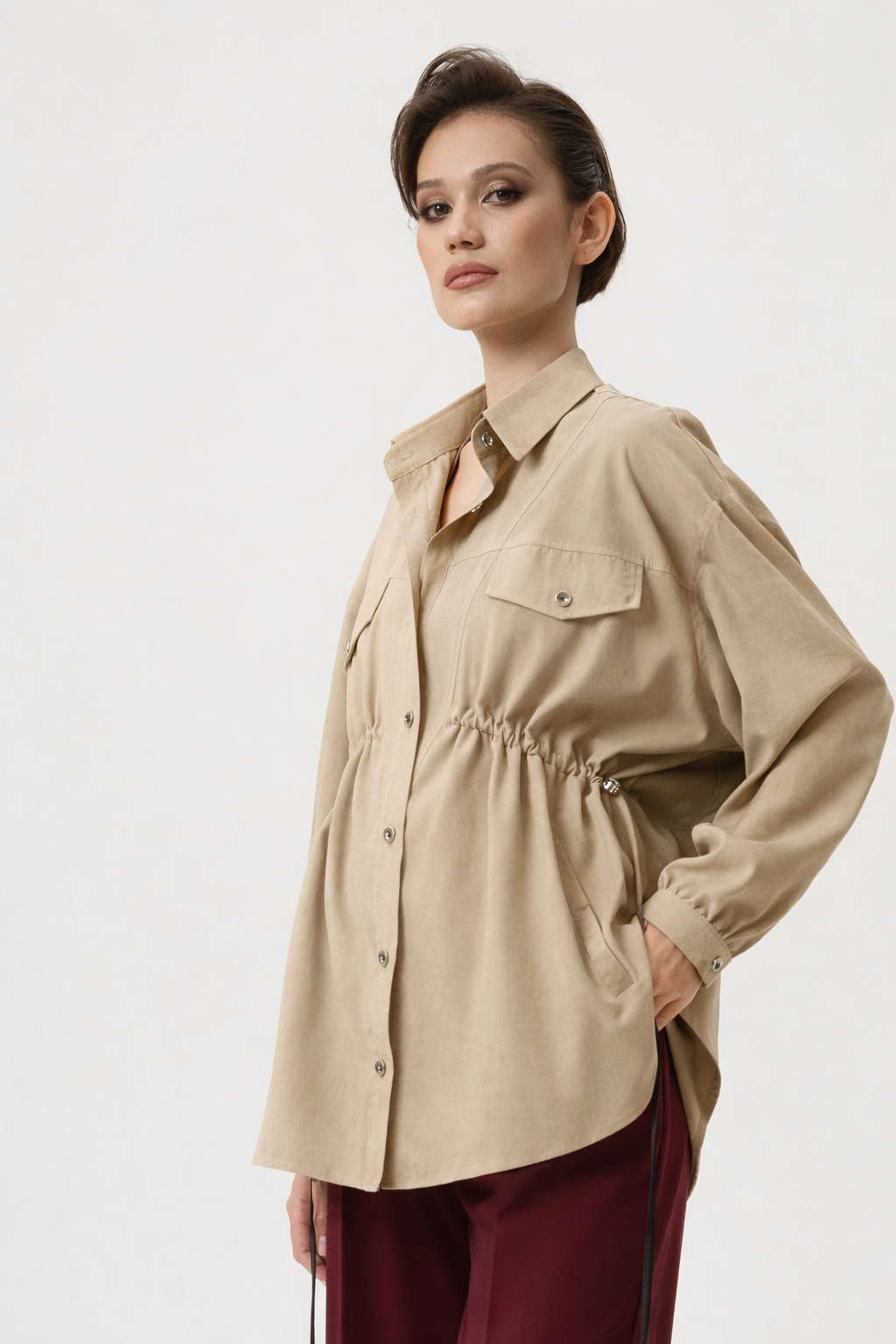 Стильная рубашка – идеальный выбор для будущих мам и тех, кто уже в послеродовом периоде. Свободный крой обеспечивает комфорт, а кулиска по бокам позволяет регулировать объем, адаптируясь к изменяющимся формам.