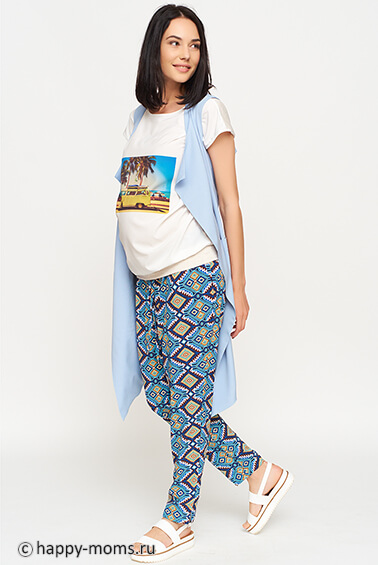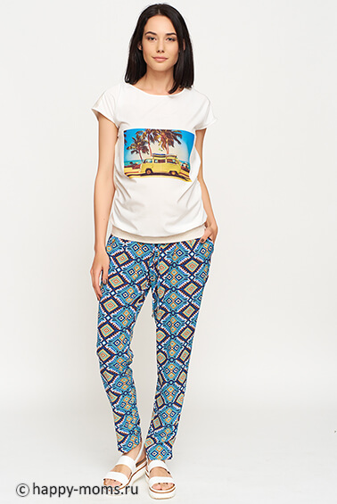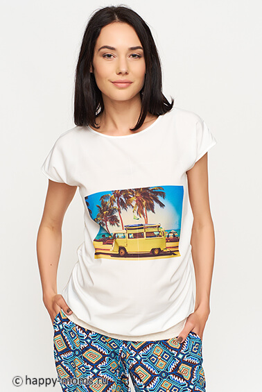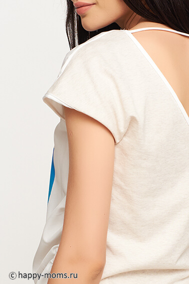 Футболка для беременных с принтом, комбинированные ткани, трикотажная спинка изделия декорирована округлым вырезом и завязками, спущенный рукав, объём на животик создаётся за счёт драпировки по бокам изделия. Футболка является одним из самых универсальных и обязательных элементов гардероба, как мужского, так и женского. Она относится к разряду ежедневных и полезных вещей, однако с ее помощью можно создать совершенно неповторимый и уникальный образ. Главное – не бояться экспериментировать! Футболка идеально сочетается со многими предметами гардероба, поэтому ее можно носить хоть круглогодично. В прохладную погоду футболку можно комбинировать с жилетами, куртками, жакетами и пиджаками.На фото: модель, рост 170 см., обхват груди - 85 см, обхват бедер 94 см, имитация 5-го месяца беременности.