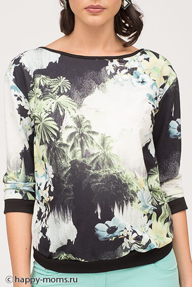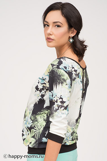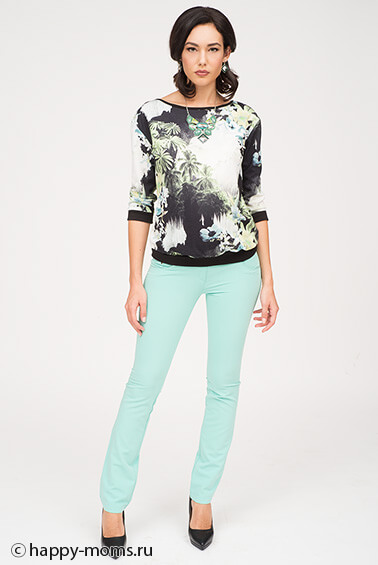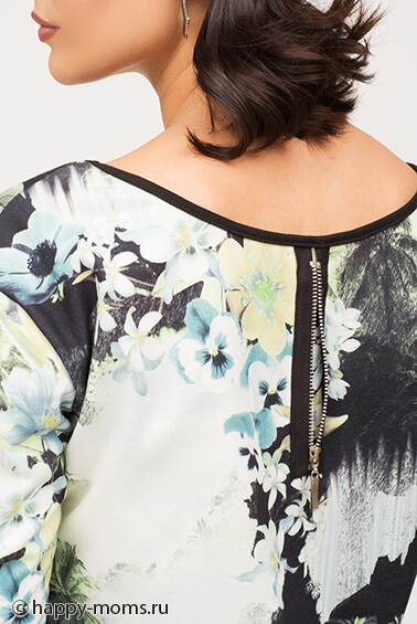 Сезон: Демисезонный. Блуза из трикотажного полотна прямого силуэта. Горловина округлой формы. Обработана горловина однотонным руликом в тон манжетам рукава и поясу. Рукав втачной. По центру спинки располагается декоративная молния. Объемная форма обеспечивается припусками на животик и эластичностью ткани. Рукав длиной 3/4 с манжетом - 4 см. Длина от плеча (по груди): 66 (±2 см). Длина от плеча (по спинке): 65 (±2 см). Ширина горловины: 27 см. Длина рукава: 40 см. Расстояние от плеча до плеча 48 см. На фото: модель, рост 170 см., обхват груди - 85 см, обхват бедер 94 см, имитация 5-го месяца беременности, размер товара 42.