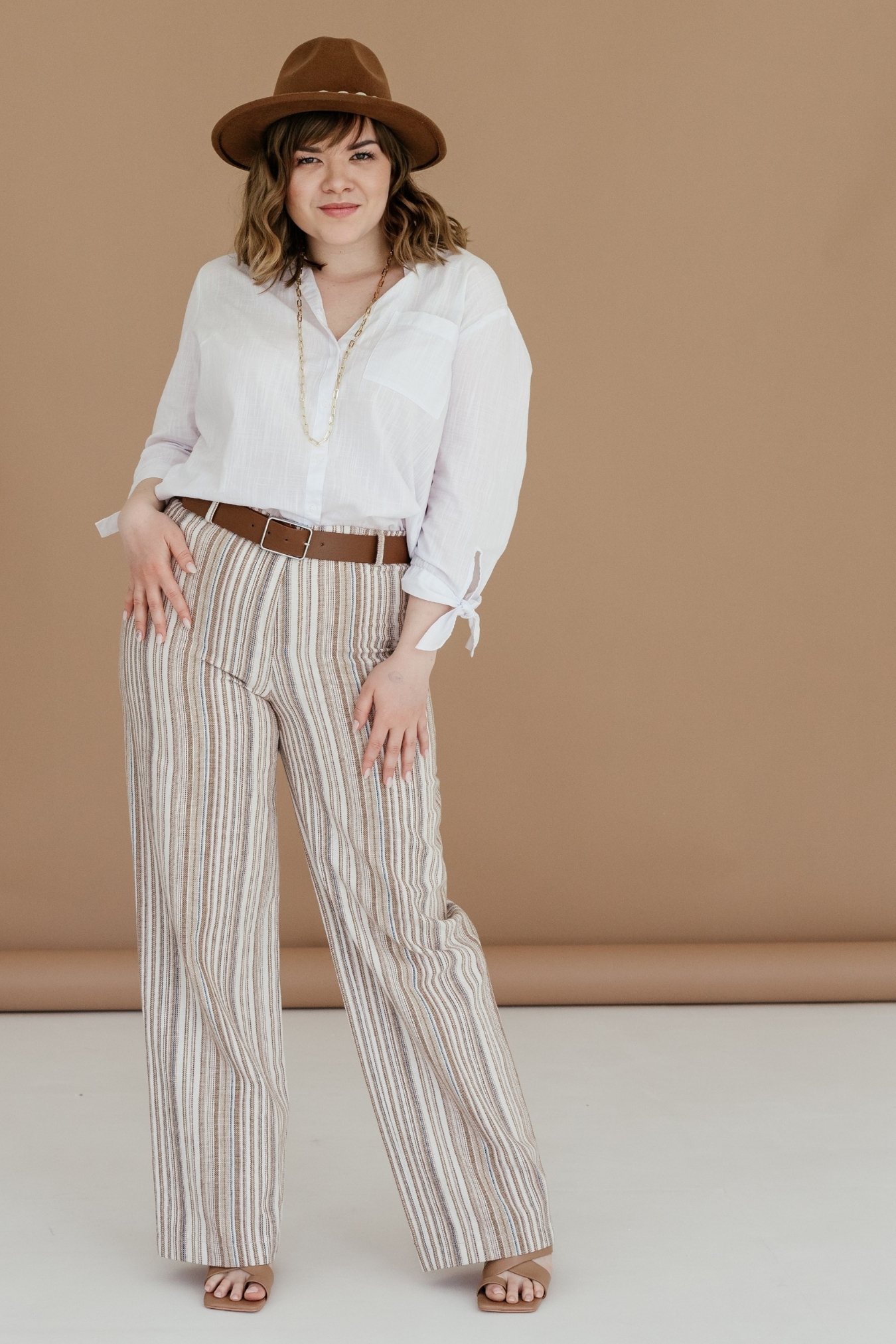 Брюки женские льняные в ассиметричную полоску бежевых оттенков. Из декора – эффектный контрастный ремень. Модель свободная, прямого широкого кроя, с боковыми карманами в швах и нефункциональными карманами сзади. Сшита из натуральной, дышащей ткани, которая отлично защищает от жары. К брюкам отлично подходит любая однотонная классическая майка или блузка, идеально, если она будет вторить их оттенку. Модель сочетается с обувью на разном ходу, балетки и слипоны сделают ваш образ более динамичным, а каблуки прибавят элегантности и женского очарования.