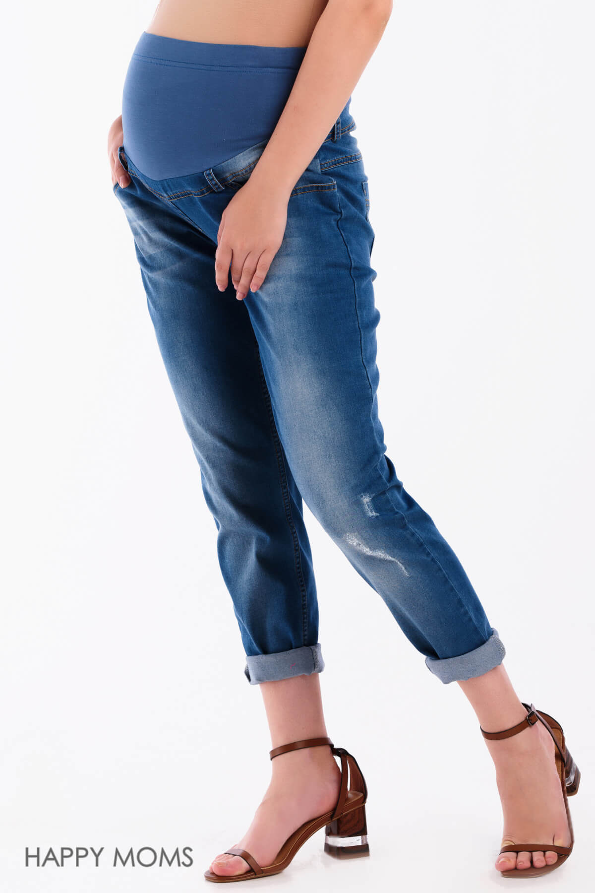 Модные джинсы-бойфренды для будущих мам. Удобный фасон, не стесняющий движений – их преимущество. Над поясом широкая эластичная вставка, которая поддержит растущий животик. Универсальные в носке – за счет вставки отлично сядут на любом сроке беременности. И никакого дискомфорта! Цвет классический синий, фасон со стилизованной потертостью, карманы стандартные для моделей из денима. Джинсы сочетаются с любым верхом, кроме классики, цвет и длина блузки, майки или футболки не имеет значения. Могут надеваться и с каблуками, тогда образ получится ближе к стилистике кэжуал, а вы в таком варианте будете выглядеть более элегантно и романтично.