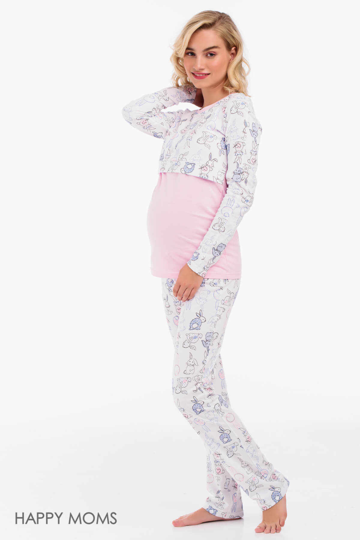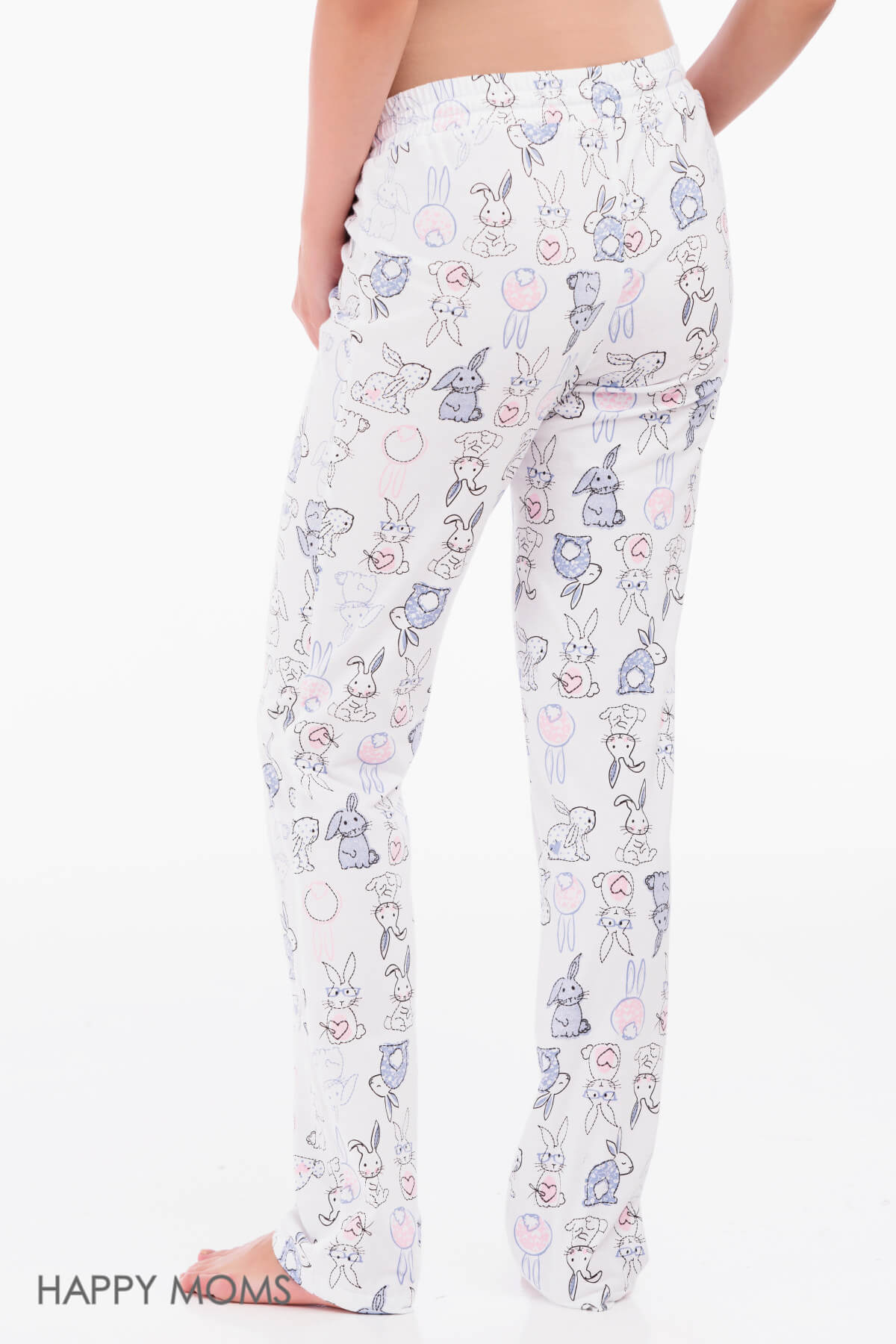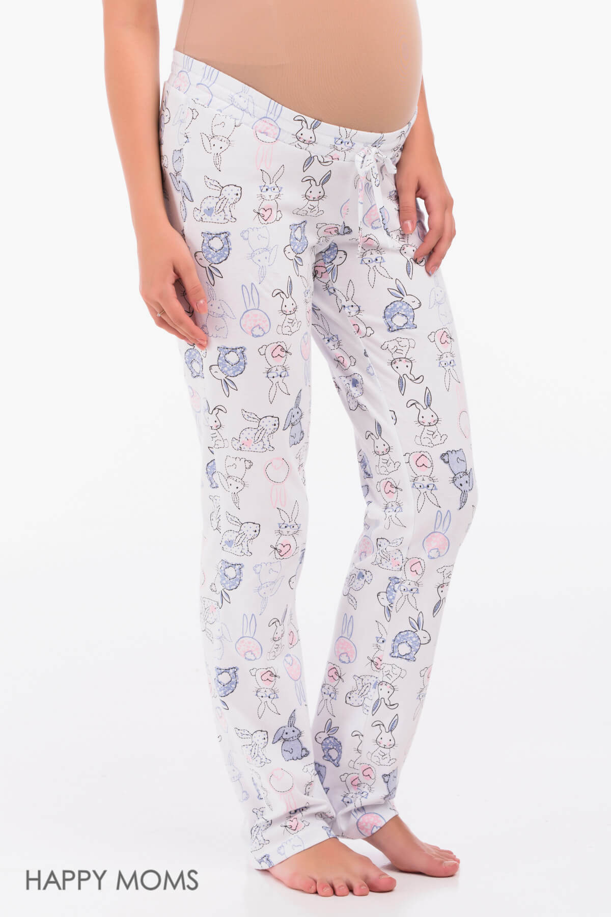 Брюки для беременных белого цвета с рисунком в виде забавных кроликов из мягкого кулирного трикотажа. Брюки прямые, на мягкой резинке и вспомогательной кулиске, объем пояса адаптируется под размеры растущего животика. Модель подойдет для любого срока беременности и после родов, хороша для всех сезонов, летом она даст телу дышать, в холодное время – сохранит тепло и добавит ощущение уюта. Модель можно использовать как пижамные брюки для беременных, трикотажные брюки для беременных, домашние брюки для беременных, брюки для беременных хлопок, брюки для будущих мам, брюки для беременных утепленные, брюки на резинке для беременных, брюки для беременных больших размеров, пижама для беременных с брюками. Магазин для беременных женщин Happy Moms - это товары для беременных женщин, вещи для беременных, одежда для будущих мам, одежда в роддом для беременных, все для беременных. Беременность и роды - прекрасный период, будьте всегда неотразимы.