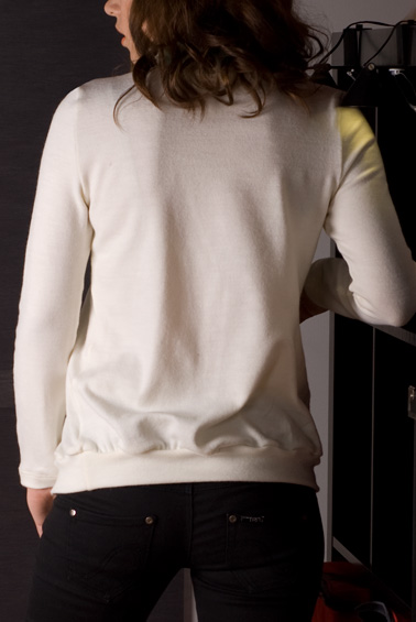 Теплый свитер с длинным рукавом, на груди кокетка с мягкими складками. Низ блузки отделан планкой. Воротник - отложнная стойка, который можно поднять в холодную погоду.