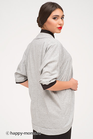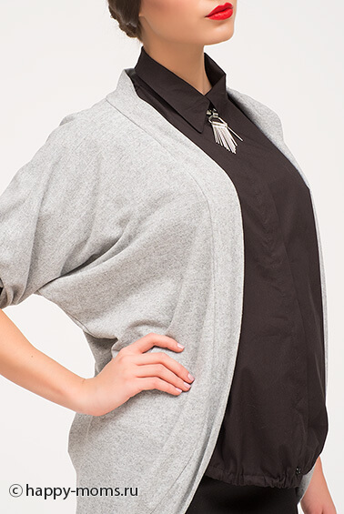 Сезон: Демисезонный. Стильный жакет из однотонного акрила, объемный, силуэт - кокон. Рукав цельнокроеный, длина 3/4. Спинка со средним швом. Край горловины, низ, край борта обработаны контрастной планкой шириной 5 см. Борта округлой формы. Боковые защипы с мягкими фалдами. Застежка отсутствует. Длина от плеча (по груди): 65 (±2 см). Длина от плеча (по спинке): 73 (±2 см). Ширина горловины: 16 см. Длина рукава: 36 см. На фото: модель, рост 170 см., обхват груди - 85 см, обхват бедер 91 см, имитация 5-го месяца беременности, размер товара 42.