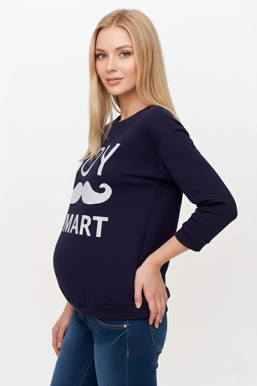 Джемпер для беременных тёмно-синего цвета, округлый вырез горловины, рукав длиной 3/4 с манжетами, с оригинальным принтом Boy Smart. Объём на животик создаётся за счёт присборки внизу изделия и эластичности ткани. Свитшот стал трендом не только осенне-зимнего сезона, но и весной, и летом мы носим этот практичный элемент гардероба с удовольствием. Он стал неоспоримым модным элементом, стильным, комфортным, который отлично смотрится с разными видами одежды. Свитшот с принтом особенно хорошо сочетается с денимом, делая ваш повседневный образ милым и уютным! Джемпер можно использовать как джемпер для беременных оверсайз, кофта для беременных. Магазин для беременных женщин Happy Moms - это стильная одежда для беременных, одежда для беременных большие размеры, товары для беременных женщин, вещи для беременных, одежда для будущих мам, все для беременных. Беременность и роды - прекрасный период, будьте всегда неотразимы.