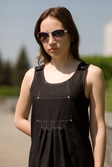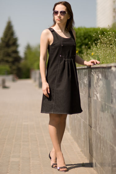 Сарафан силуэта трапеция, за счёт рельефов. Под грудью заложены застроченные складки, что позволяет носить сарафан во время и после беременности. Бретели застёгиваются на пуговицы. Сарафан отстрочен белыми нитками. Длина изделия от плеча до низа, по груди -88 (±1)см.