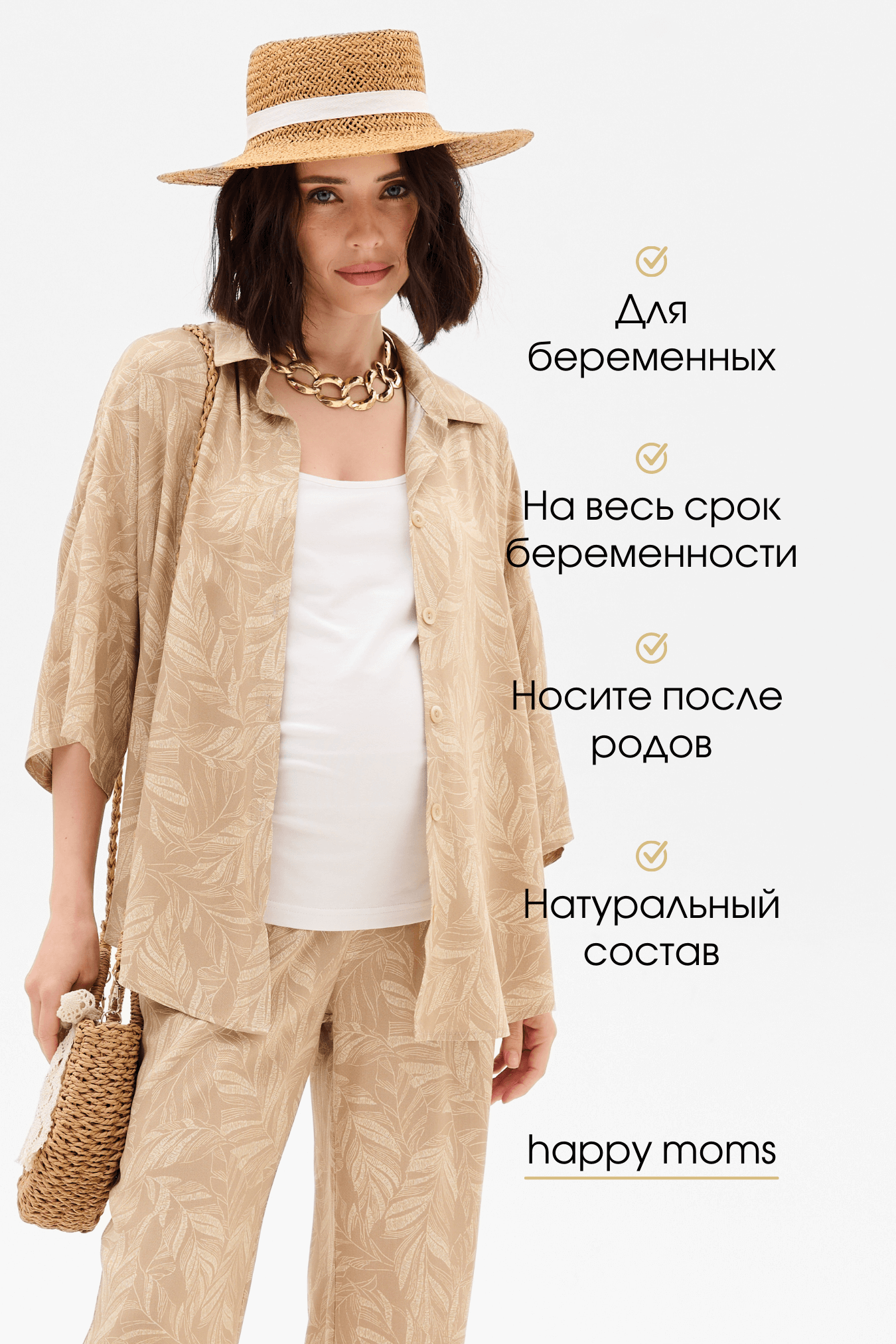 Легкий брючный костюм для беременных летний теплого песочного оттенка с крупным принтом. Комплект женский состоит из рубашки и брюк. Рубашка просторная, плечо спущено, рукава укороченные 3/4.