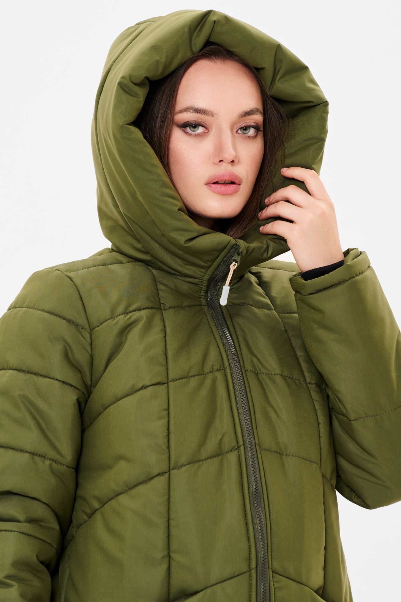 Куртка для беременных зимняя теплая пуховик зеленого оттенка длиной до колен. В данной модели не предусмотрена съемная вставка, но конструкция разработана таким образом, что заложен объем для растущего животика.