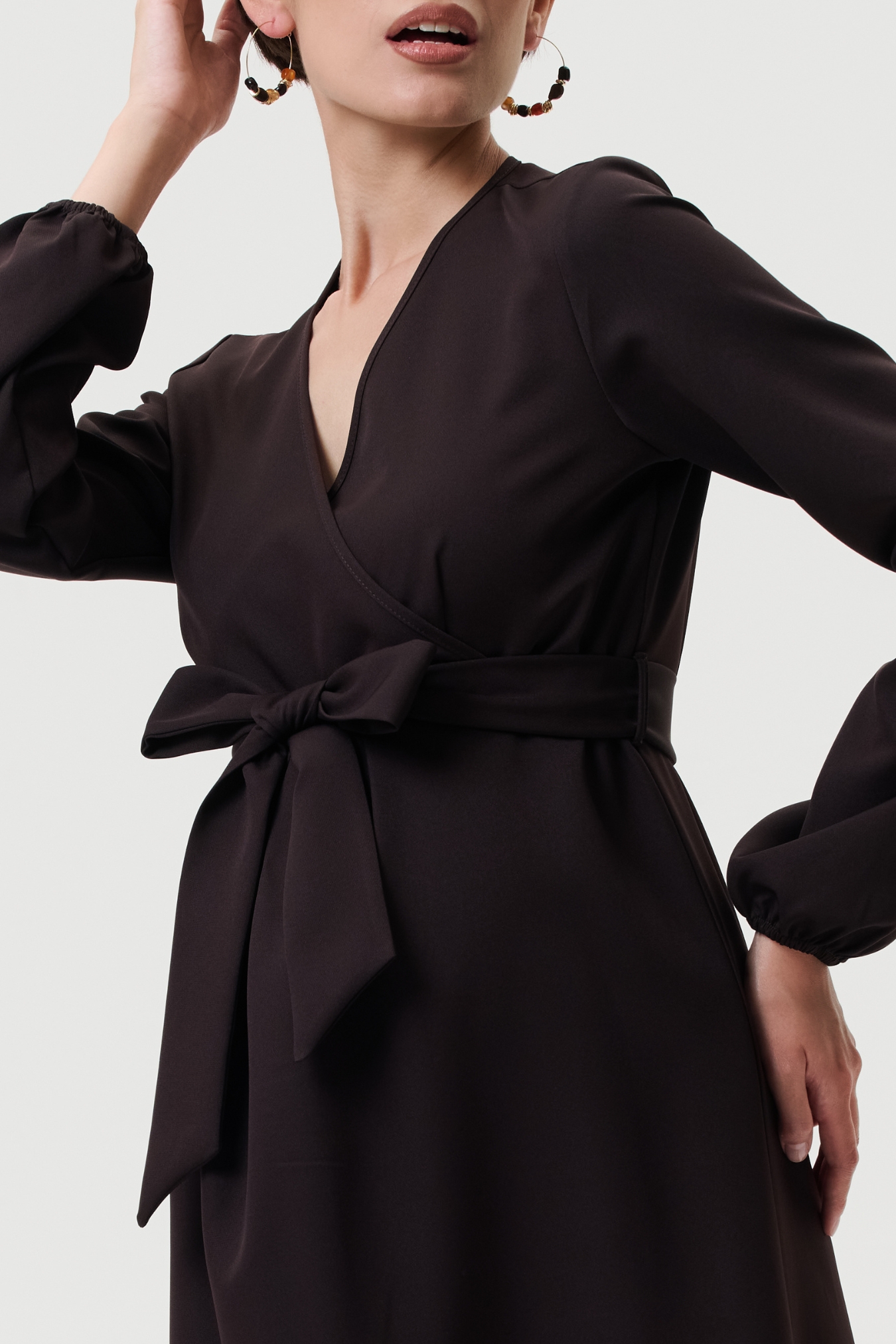 - V-образный вырез и запах подчёркивают зону декольте и визуально вытягивают силуэт.