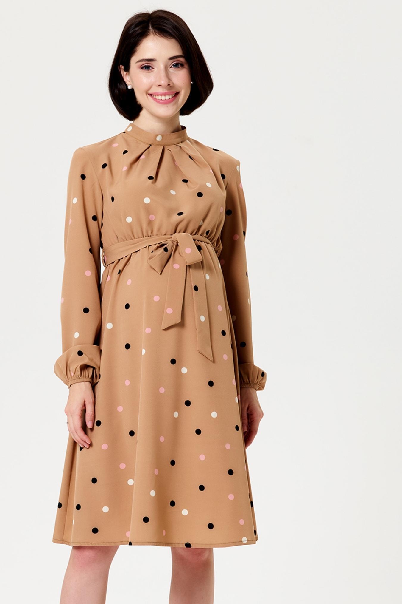 Платье для беременных классического стиля бежевого цвета длиной до колен. Насыщенность основного тона разбавляется гороховым принтом.
