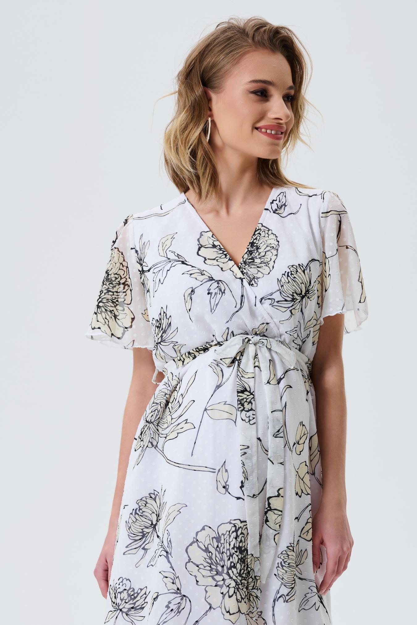 Платье женское летнее для беременных белое с крупным цветочным принтом пастельного цвета длиной чуть ниже колен. Вырез на запах, форма рукава – колокольчик.