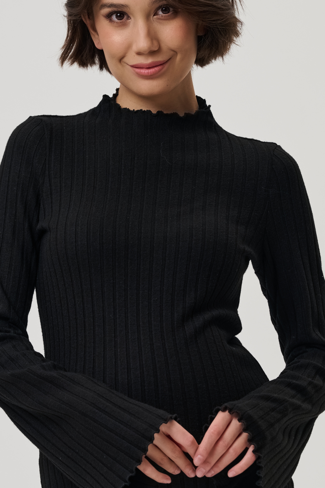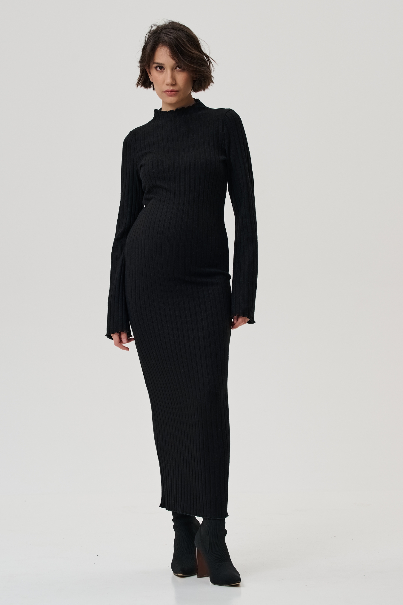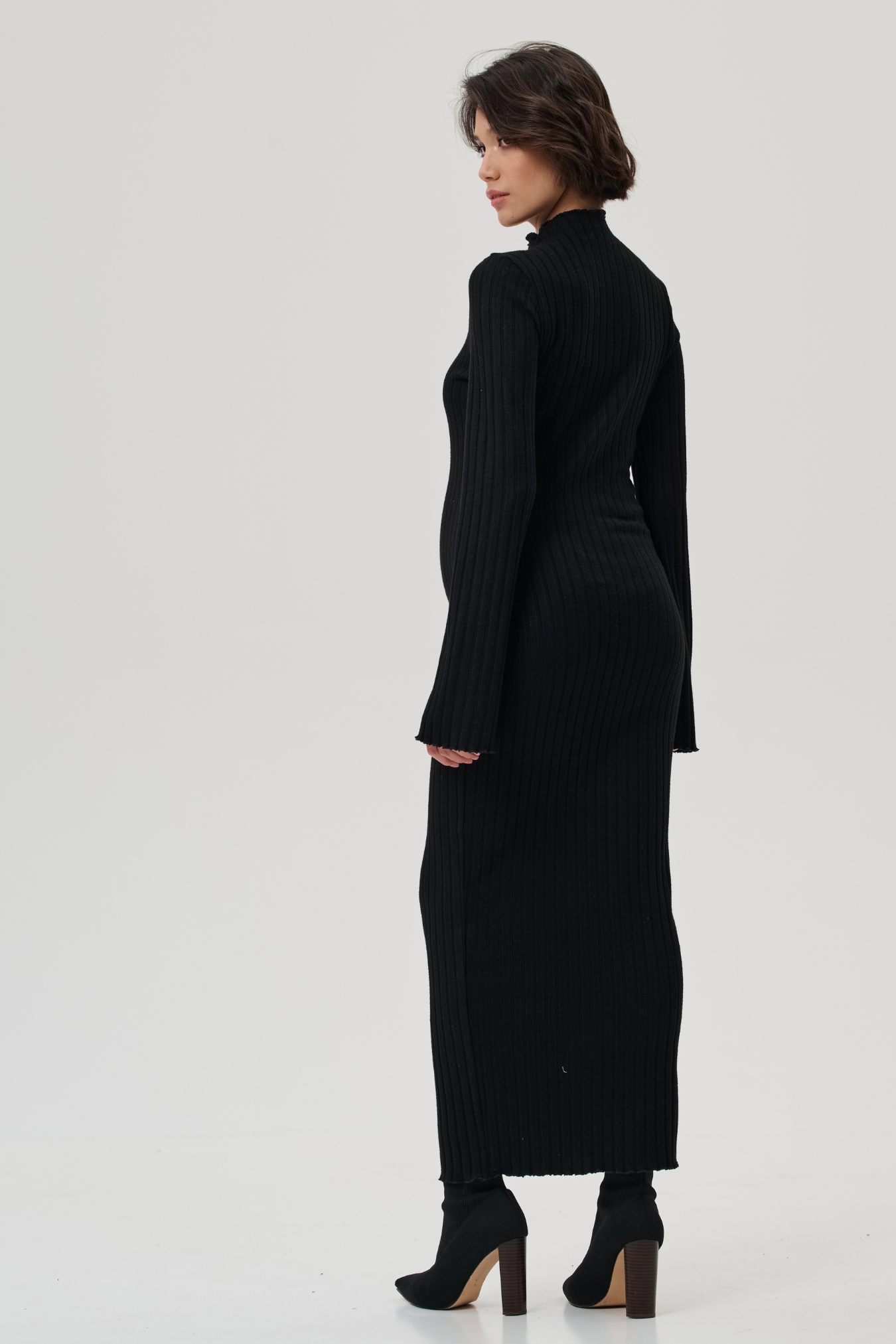 Платье для беременных утепленное черное из мягкого плотного трикотажного полотна в рубчик длиной макси. Приятная ткань, прямой крой, аккуратная горловина-стойка, длинный расклешенный рукав.
