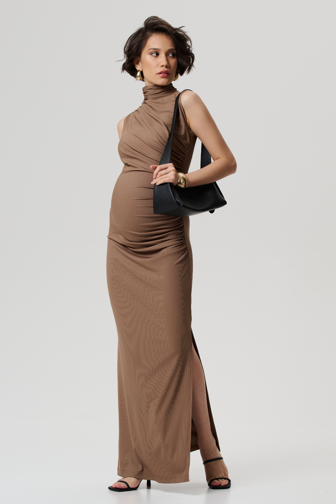 Аккуратная горловина-лодочка обрамляет шею. Просторные слегка расклешенные рукава не стесняют движений. Шнуровка на спинке поможет скорректировать объем талии. Платье будет удобным на любом сроке и после родов. Эффектный высокий разрез добавит изюминку. Дополнить образ помогут яркие украшения и аксессуары.