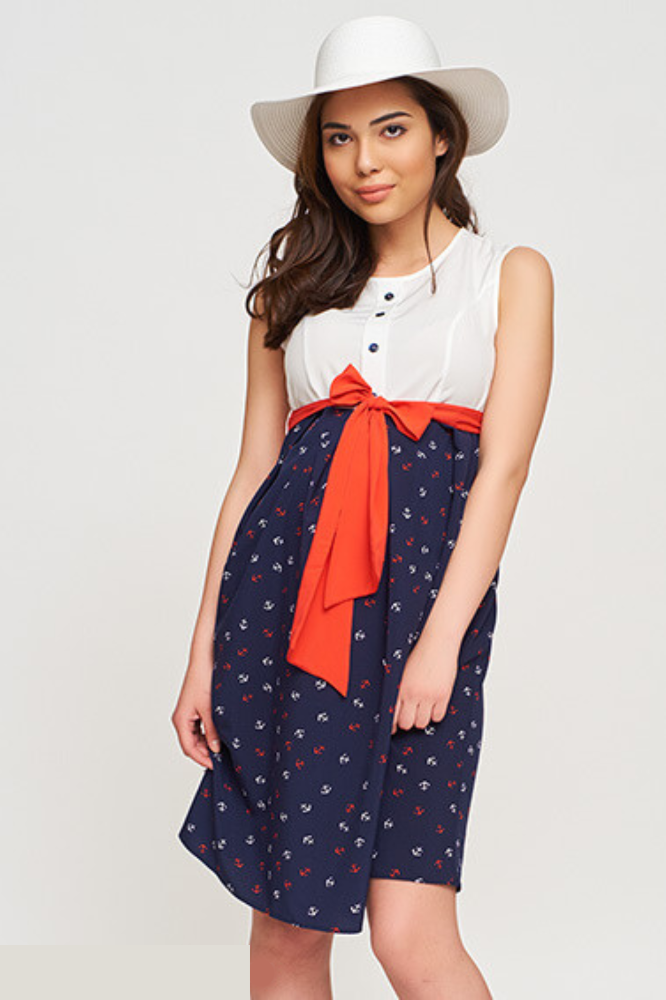 Комбинированное летнее платье для беременных. Верх выполнен в виде белой блузы с контрастными пуговицами, без рукавов, тёмно-синяя юбка с принтом якоря, длина до колена, дополнено красным поясом-бантом, объём на животик создаётся за счёт складок. Ничто так не подходит для отдыха на морском курорте, как одежда и аксессуары в морском стиле. Полоски, якоря, канаты и прочие морские принты, пришедшие из моряцкого гардероба, навевают мысли о дальних странствиях, прогулочных яхтах и шуме прибоя. Даже если вы остались в «каменных джунглях», одежда в морском стиле привнесет отпускное настроение, а вас сделает одновременно нежной и дерзкой!