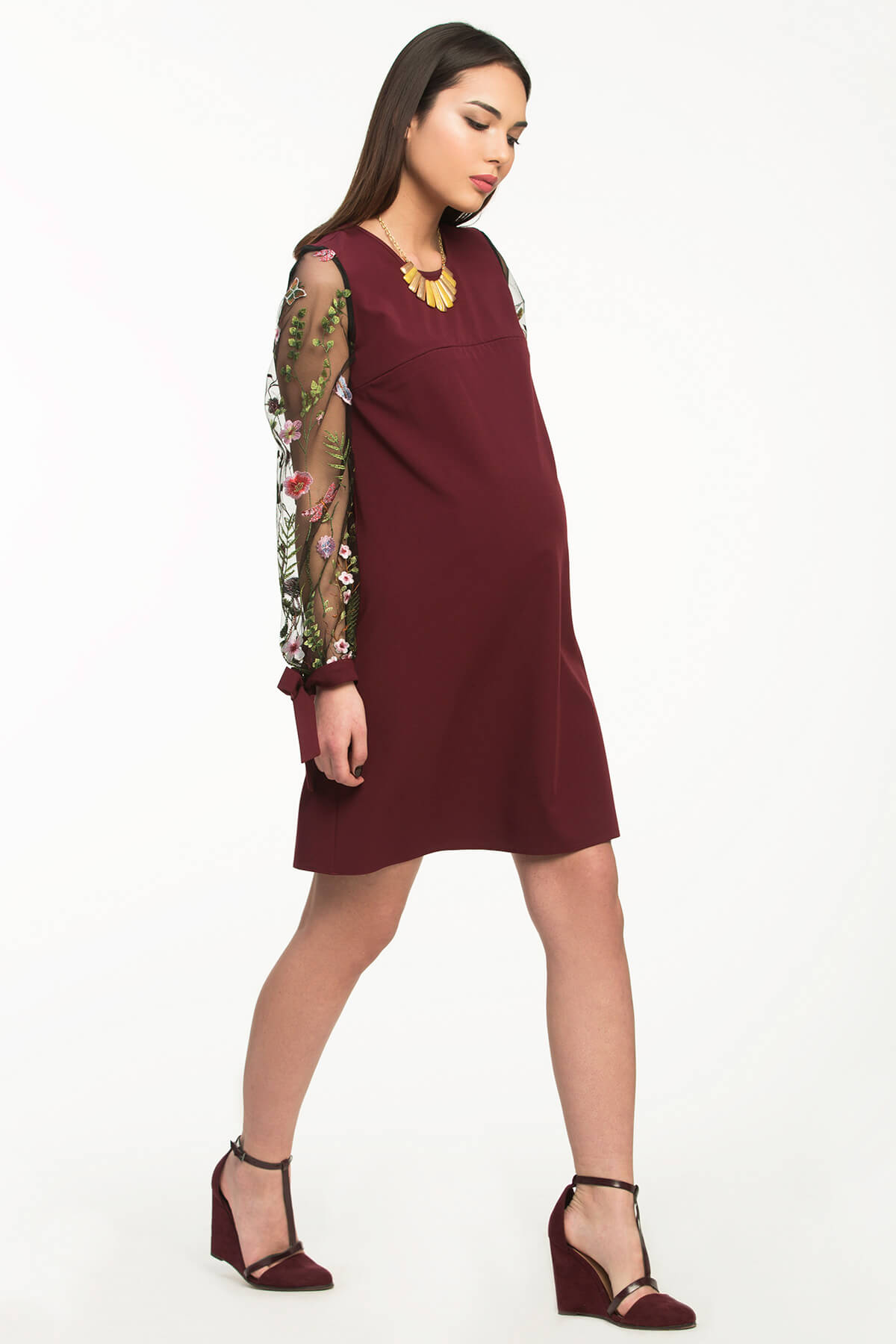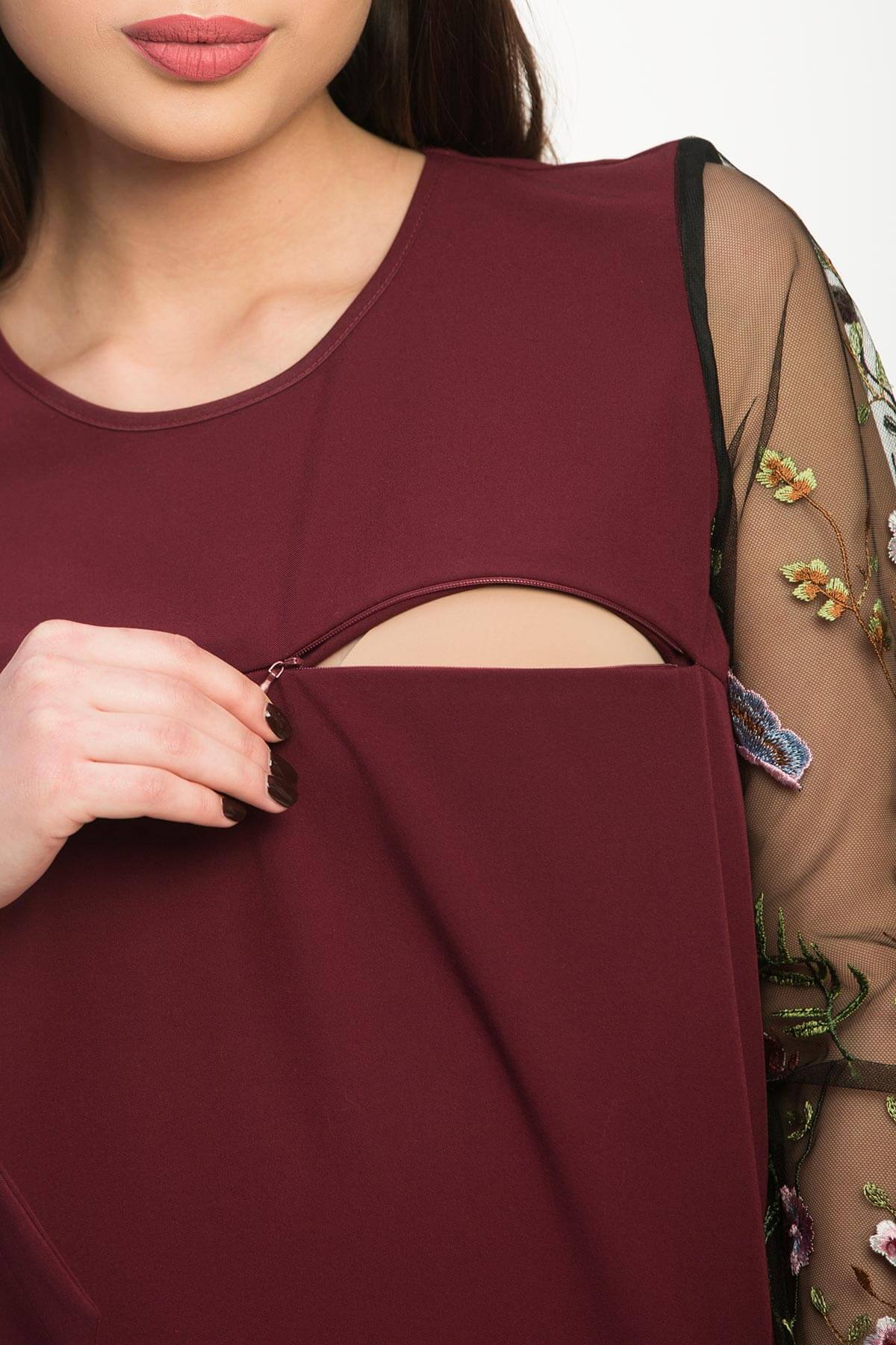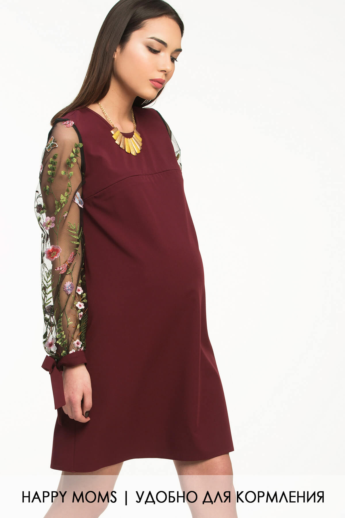 Роскошное платье насыщенного бордового оттенка для беременных и кормящих мам. Лаконичность А-образного силуэта взрывается ультра модными рукавами из тончайшего черного гипюра, виртуозно расшитого цветочными мотивами. Лаконичный круглый вырез и отсутствие мелких деталей перемещают на рукава все акценты, основной тон платья поддерживают необычные манжеты-завязки. Обратите внимание на кокетку – она не просто разбавляет минимализм кроя, в ней спрятаны две молнии, которые при необходимости могут быть использованы для комфортного кормления ребенка. Платье отлично держит форму, элегантно облегает животик, обеспечивая удобство и хорошую посадку на любом сроке беременности.