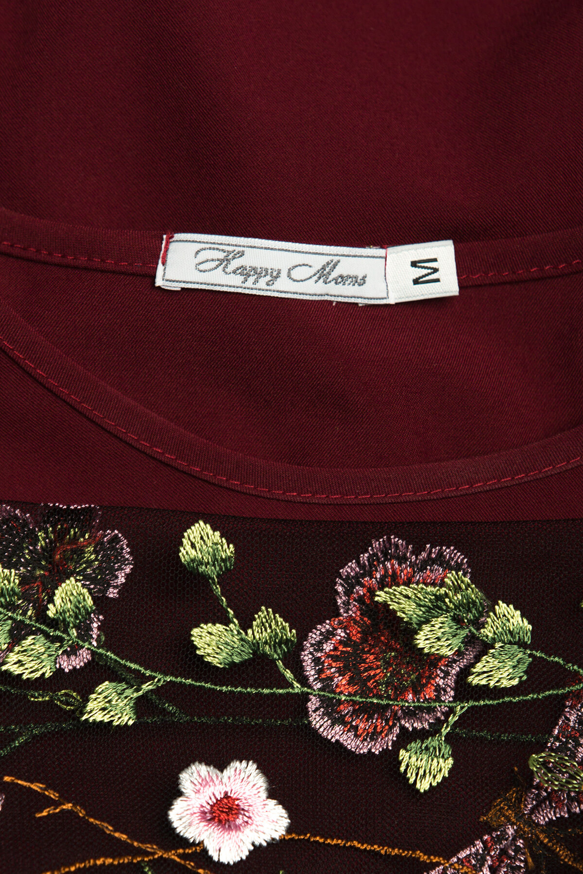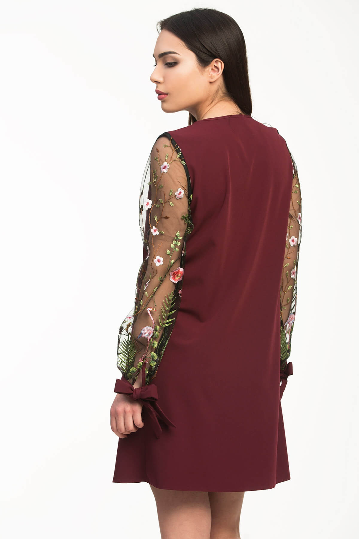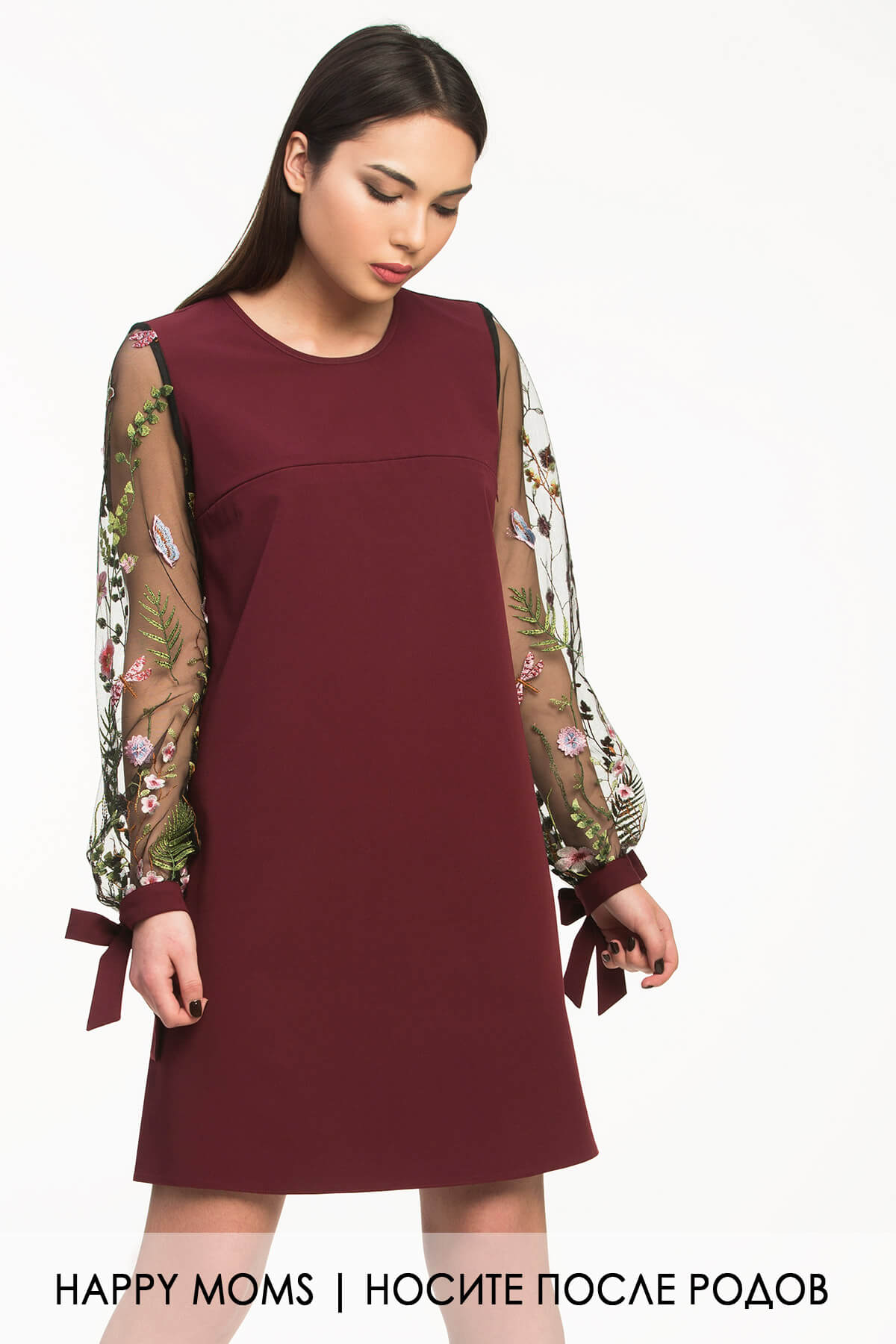 Роскошное платье насыщенного бордового оттенка для беременных и кормящих мам. Лаконичность А-образного силуэта взрывается ультра модными рукавами из тончайшего черного гипюра, виртуозно расшитого цветочными мотивами. Лаконичный круглый вырез и отсутствие мелких деталей перемещают на рукава все акценты, основной тон платья поддерживают необычные манжеты-завязки. Обратите внимание на кокетку – она не просто разбавляет минимализм кроя, в ней спрятаны две молнии, которые при необходимости могут быть использованы для комфортного кормления ребенка. Платье отлично держит форму, элегантно облегает животик, обеспечивая удобство и хорошую посадку на любом сроке беременности.