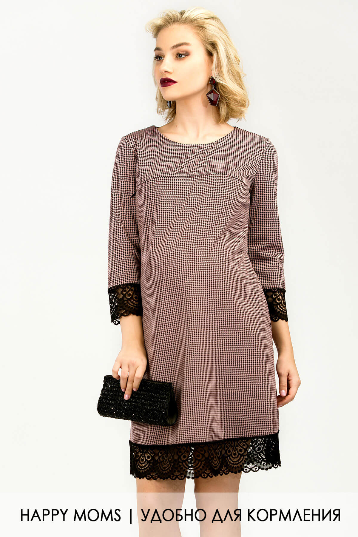 Платье для беременных нарядное коричневого цвета с принтом гусиная лапка и контрастной кружевной отделкой длиной до колен. Низ модели и рукавов украшен черным кружевом.