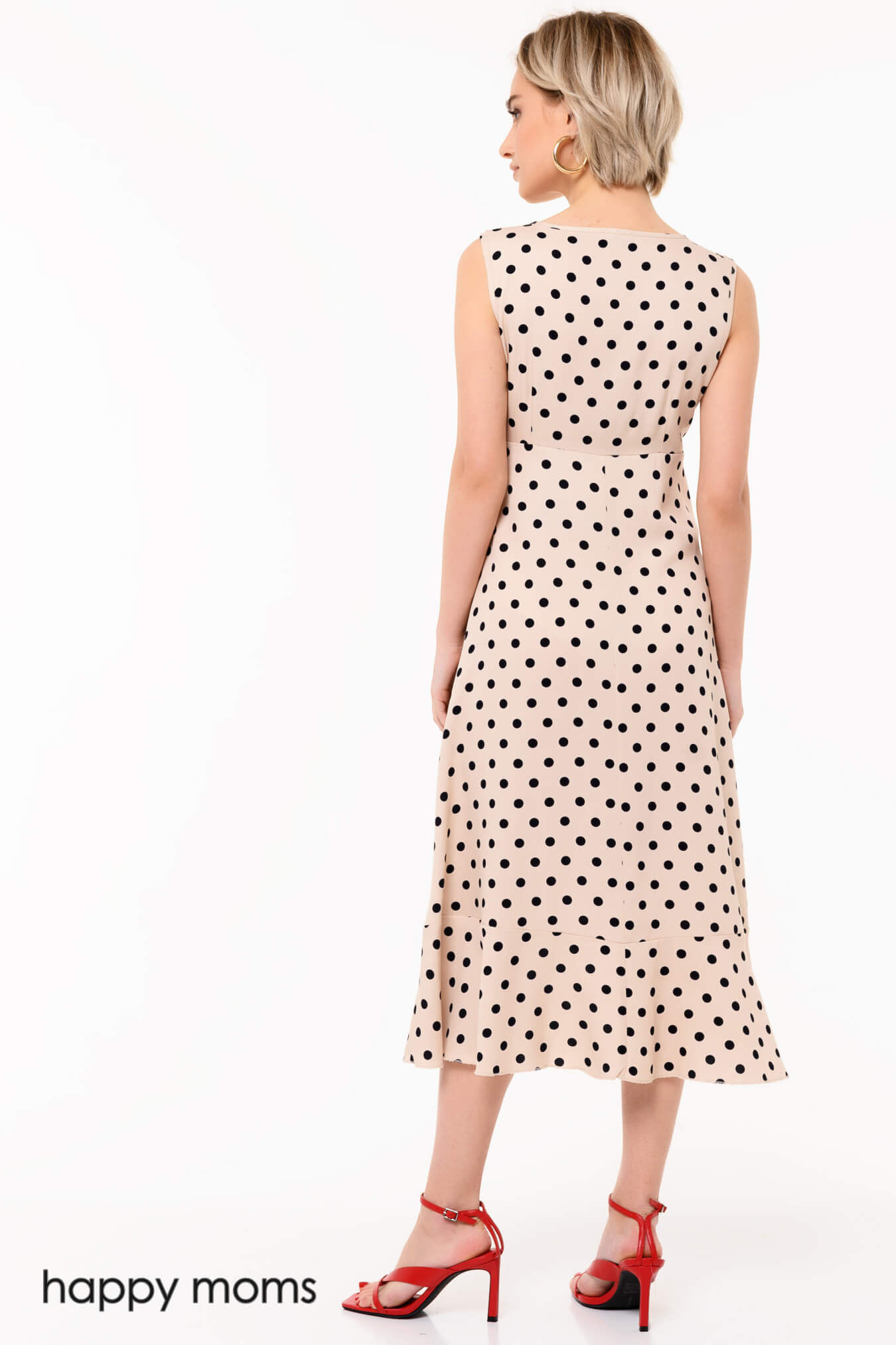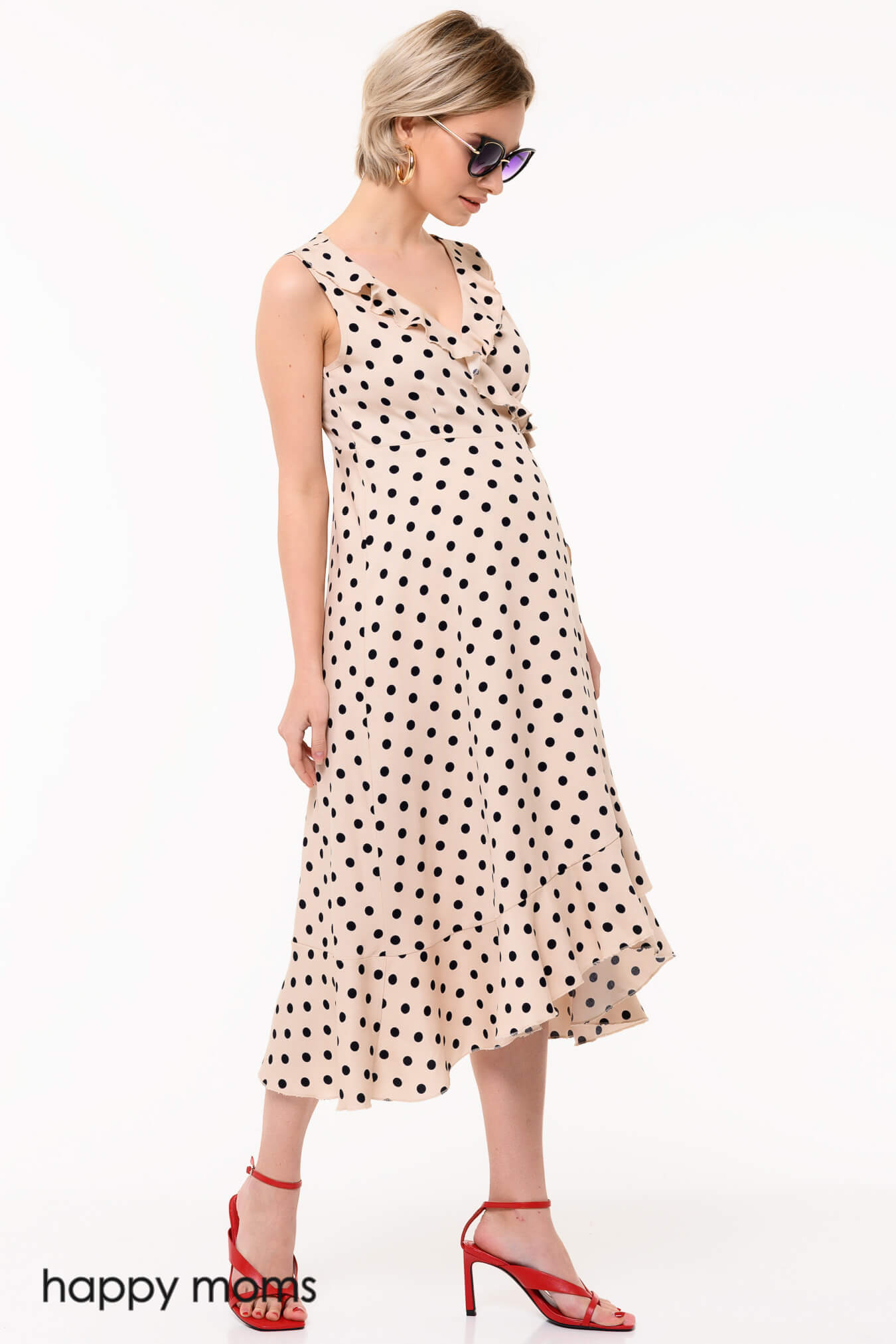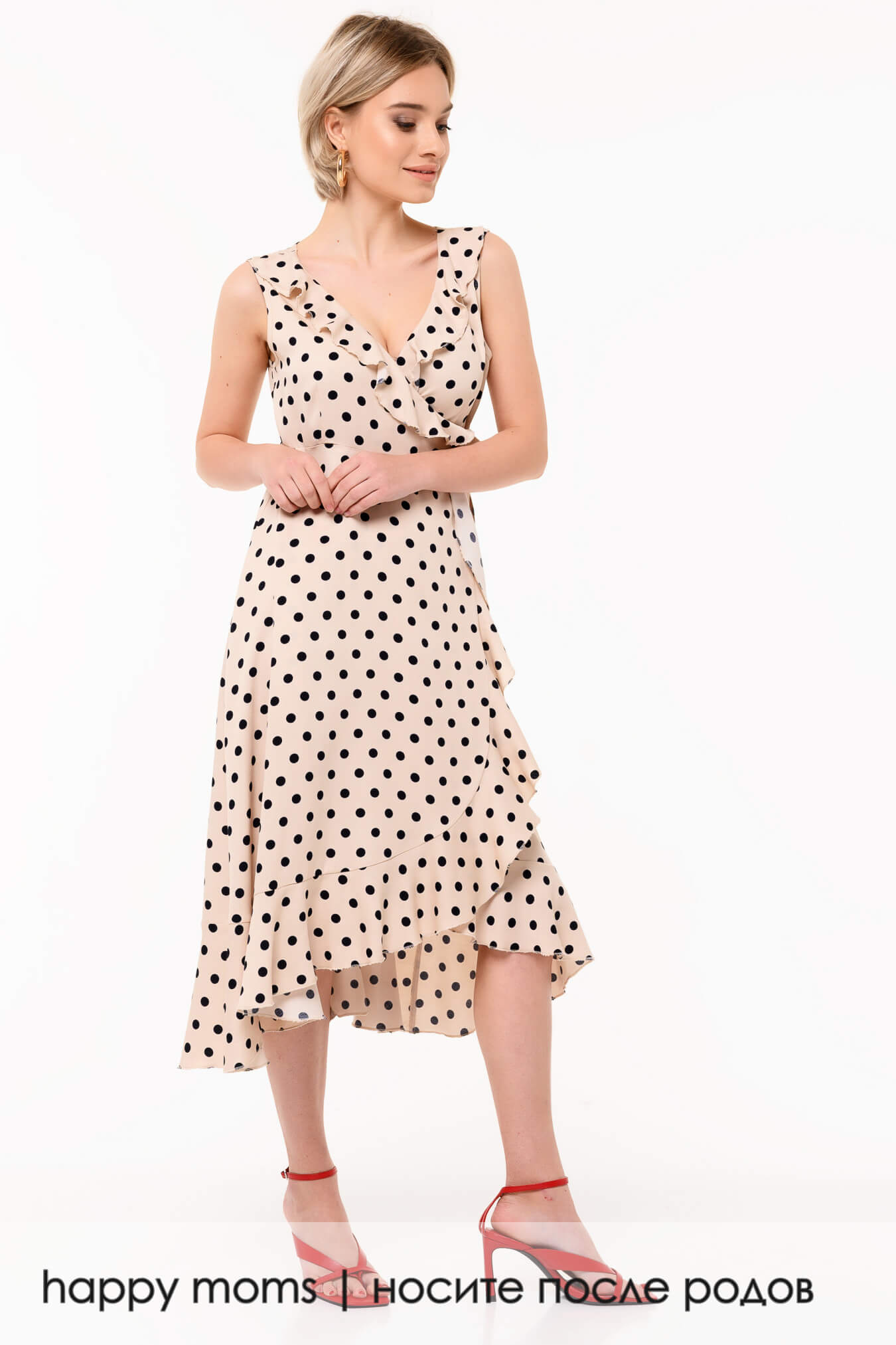Легкое платье пастельного цвета с запАхом. Волан по вырезу и всей длине передней полочки добавляет модели романтичности. Длина ниже колена придает образу женственного очарования. Тканевый поясок фиксирует ширину модели, завязывается на декоративный бант сбоку. Модель без рукавов, со свободной, летящей юбкой, чуть более короткой спереди. В таком платье будет комфортно и не жарко, оно прекрасно сочетается с элегантной обувью на низком или высоком ходу. За счет интересного кроя, предусматривающего множество декоративных деталей и контрастный гороховый принт, платье не требует дополнительных аксессуаров. Модель самодостаточна и легко добавит выразительности любому образу.